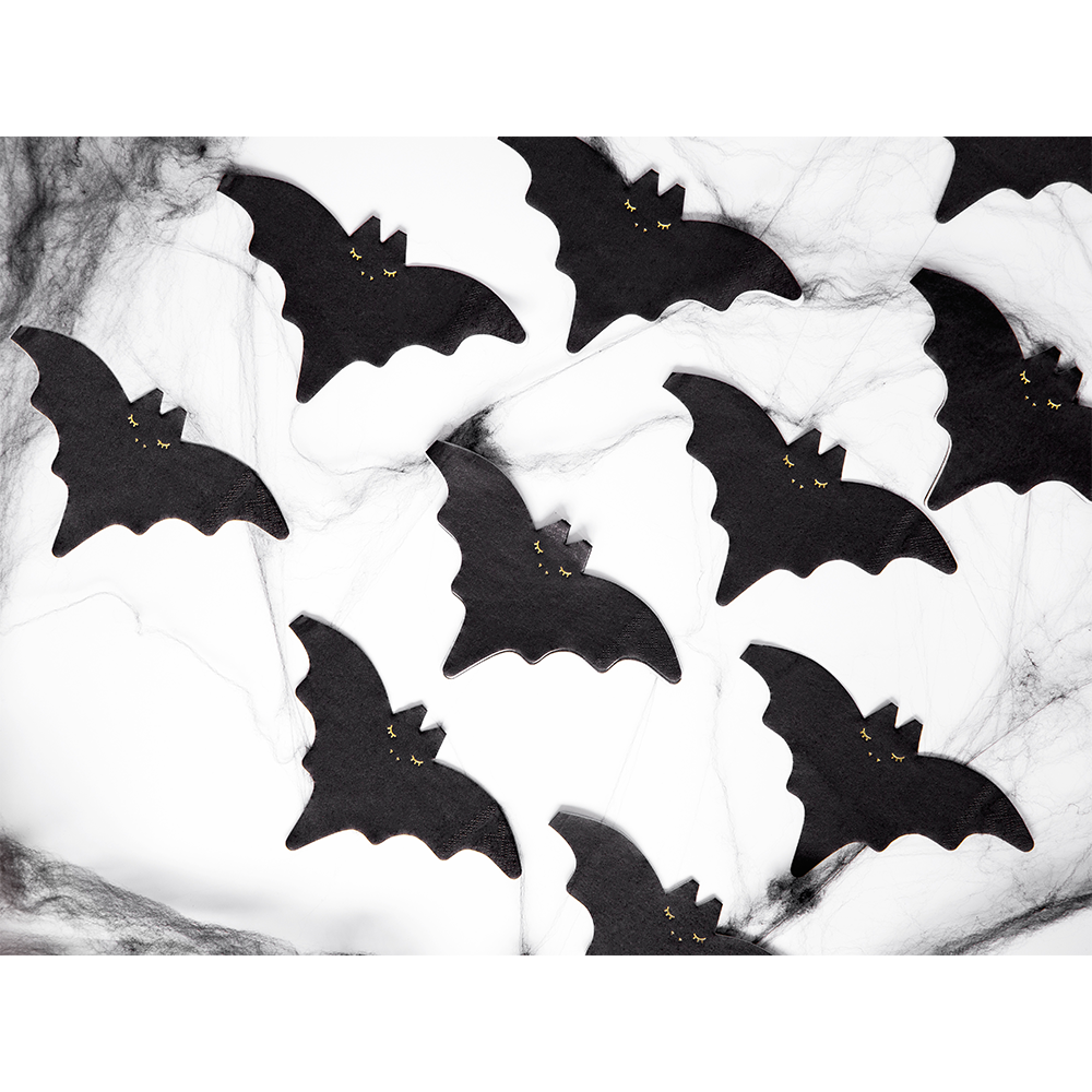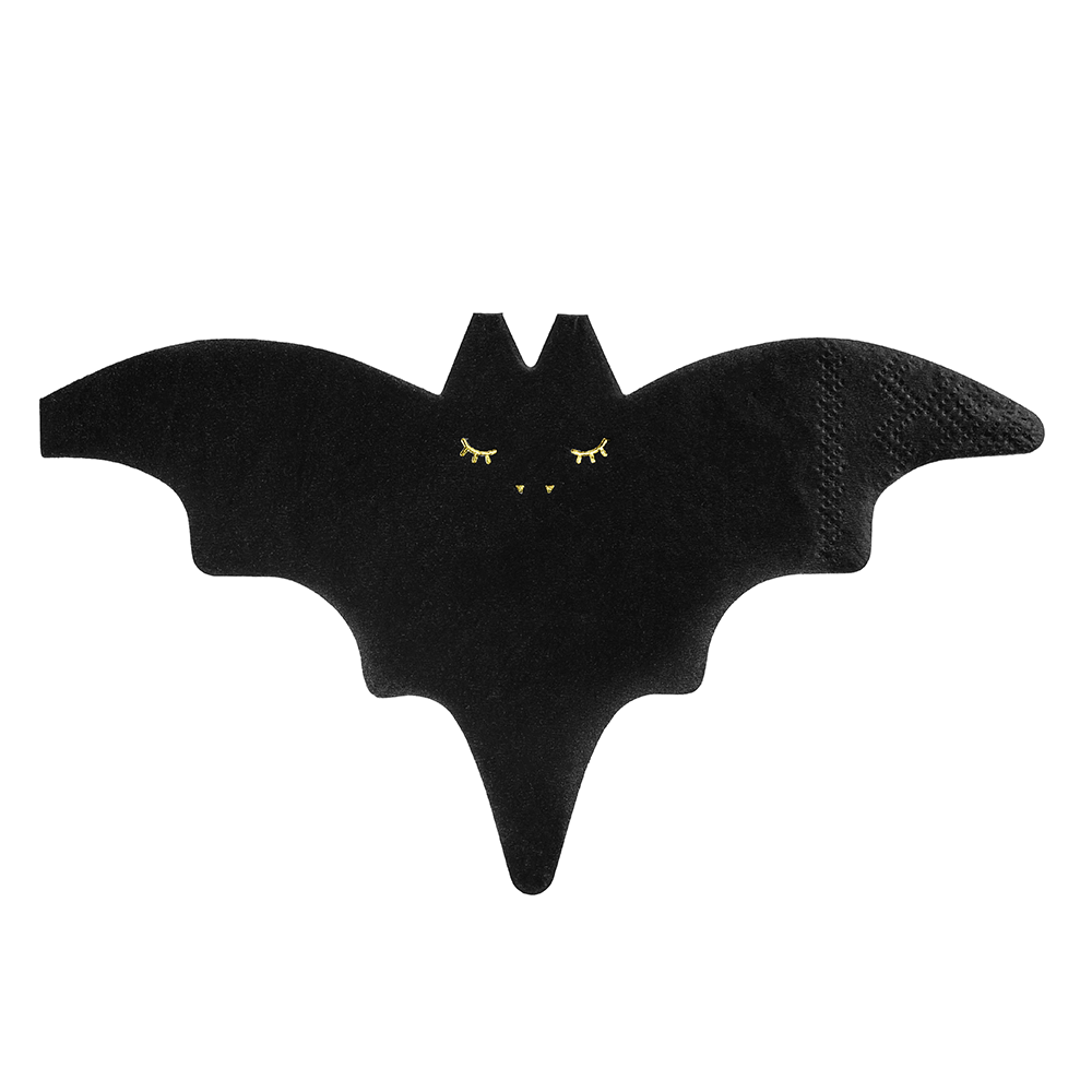 Add a spooky touch to your party with these fun Bat-Shaped Napkins! Perfect for Halloween, or any eerie celebration..... Features a black bat shaped napkin with gold metallic face.