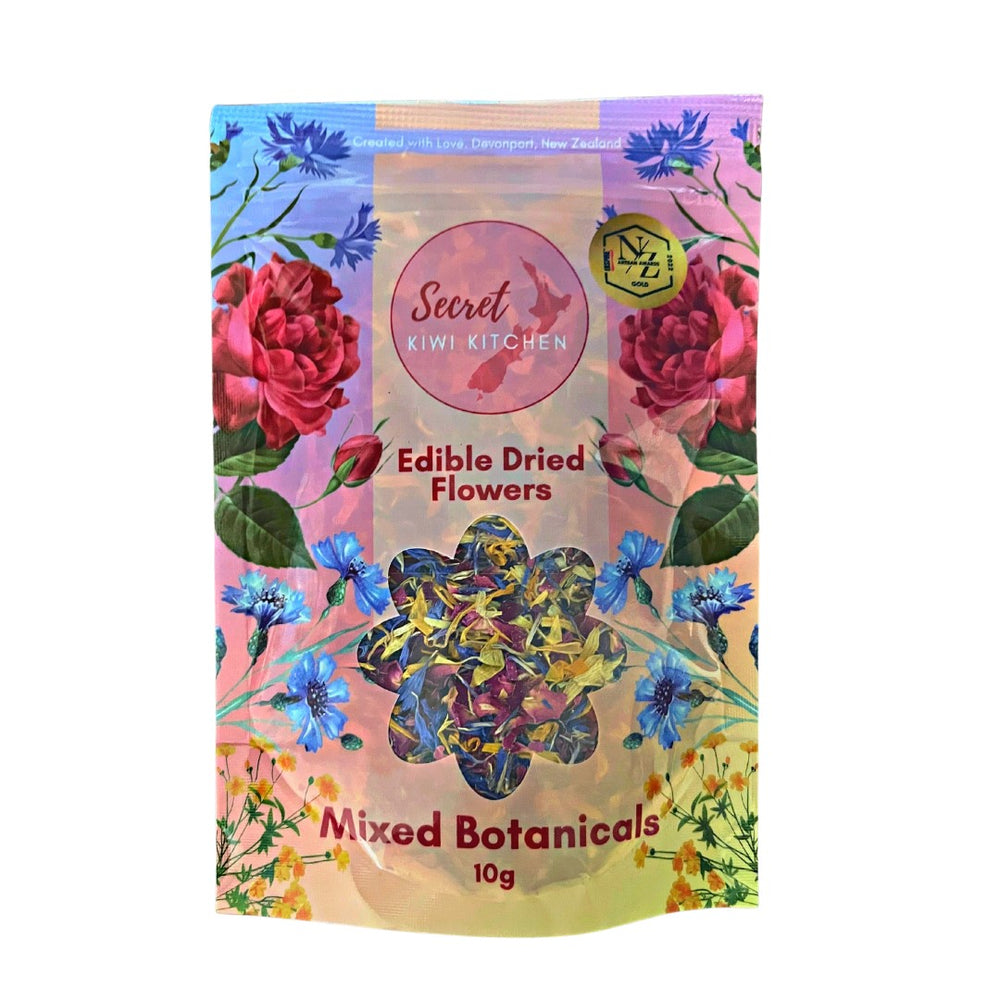 Decorate cakes, baked goods, cocktails or any dish you are serving with a sprinkle of these beautiful and brightly coloured edible flowers. A Mixed Botanical Blend including Rose, Blue Cornflower, Calendula, Blue Mallow.