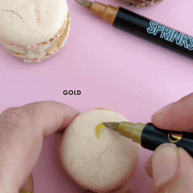 Decorate your baking and more with this SPRINKS Gold Edible Metallic Pen. This double-sided felt tip marker is made with food sale, edible metallic ink which will add a shimmering gold finish to various sweet treats.