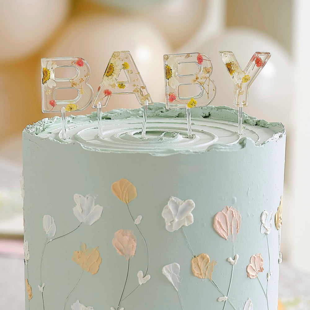 4 x clear resin pressed flower cake topper, spelling out 'baby'.