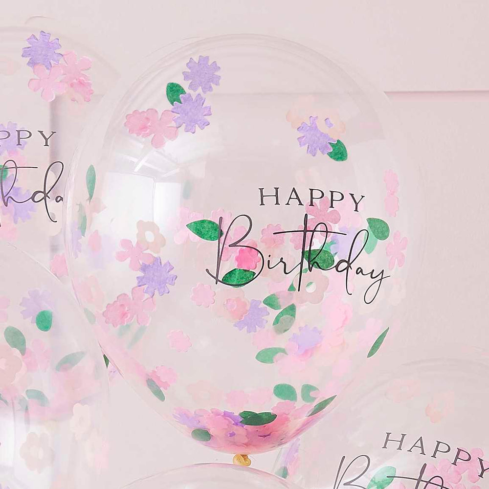 Add a floral touch to your birthday decorations with these Ginger Ray Floral confetti filled happy birthday balloons. These happy birthday balloons bring a floral touch to your celebration, the clear confetti balloons are filled with colourful confetti to add a splash of colour.