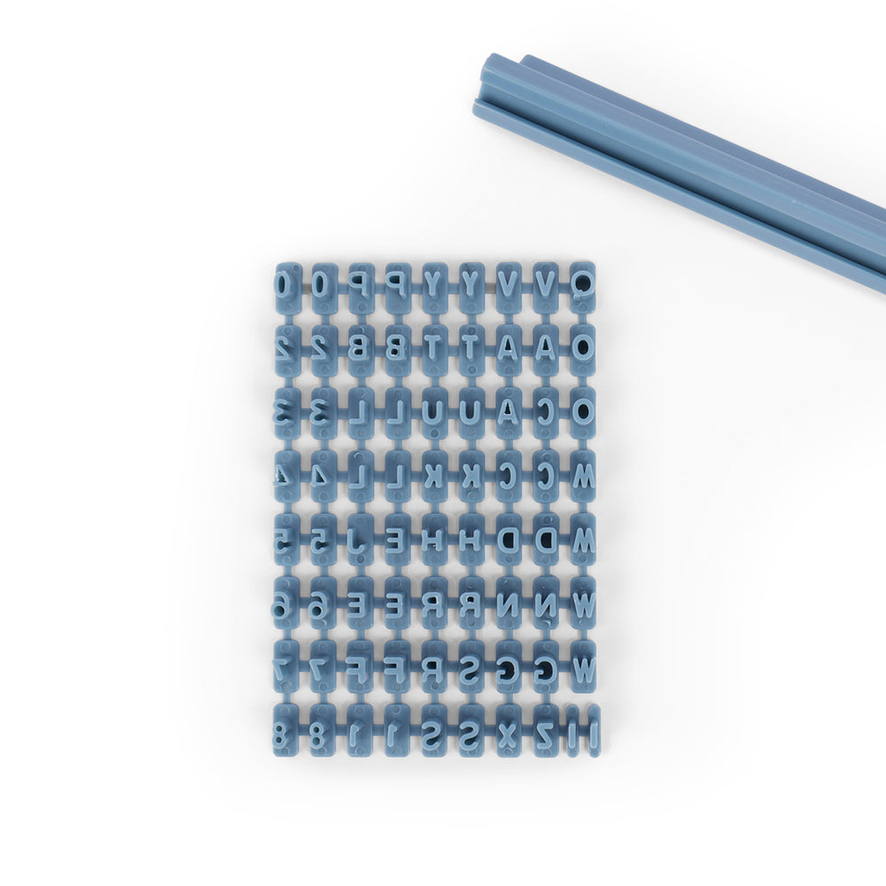 This mini alphabet & number embosser set with cutter includes a full set of upper case letters A-Z (as well as multiples of popular letters) and numbers 0-9.
