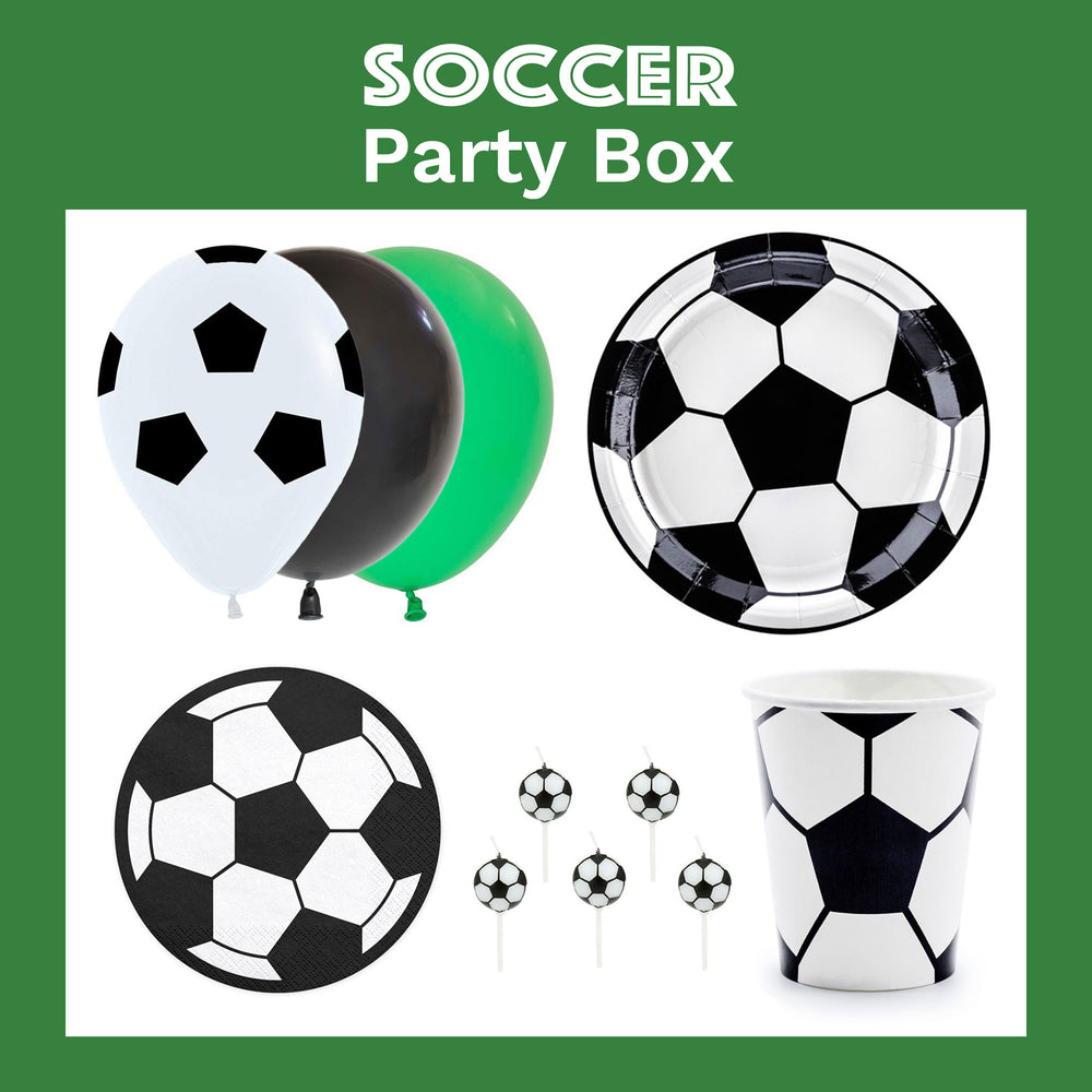 Kick off your season with this fun soccer party box. It includes the essential party supplies as well as decorative pieces for the perfect football party.
