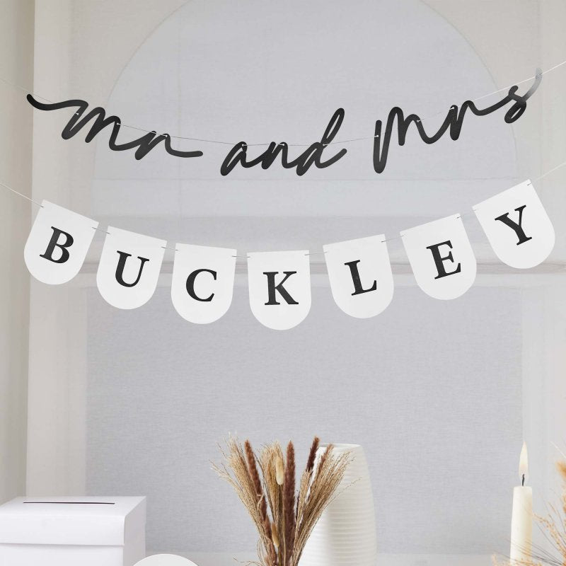 Add a timeless touch to your celebration with this elegant black-and-white “Mr & Mrs” banner. Featuring Mr and Mrs on the top line, and space below to customise with your names. A stylish décor piece that suits any wedding theme, from classic to modern.