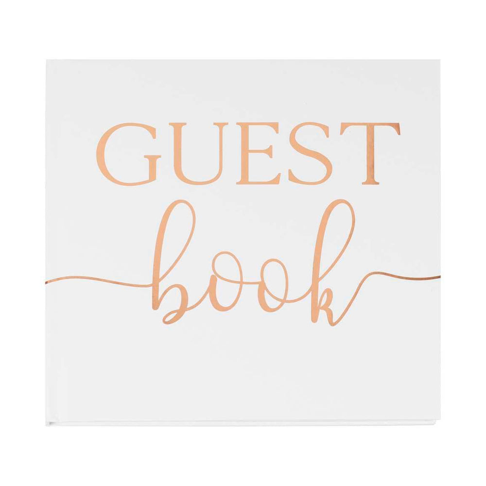 Our Ginger Ray rose gold wedding guest book is an amazing way to relive memories from your special day. The elegant rose gold foil scripted writing shimmers across the white background making for a unique wedding guest book.