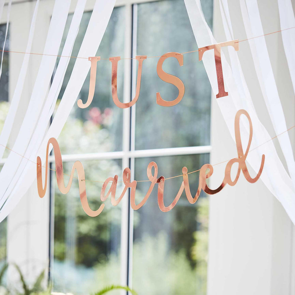 This gorgeous Ginger Ray rose gold Just Married wedding banner is the perfect decoration for your wedding day! The stunning scripted font will look beautiful at all wedding venues and sure to be loved be all.