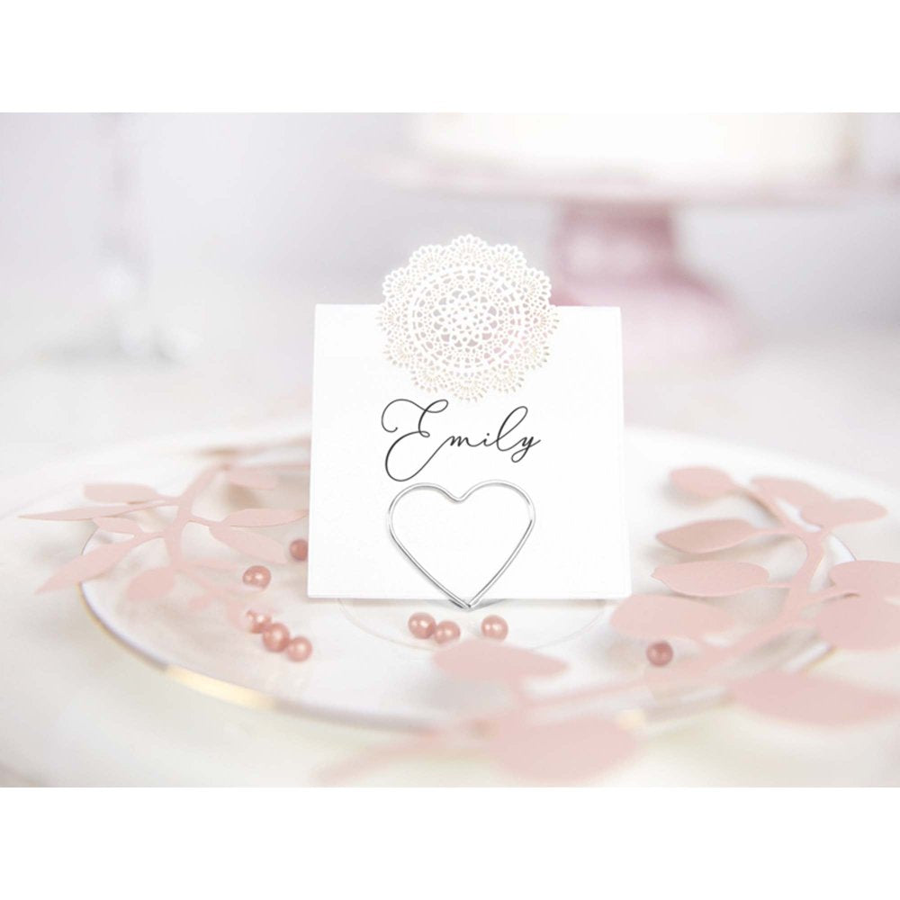 Each pack contains 10 silver heart place card holders.
