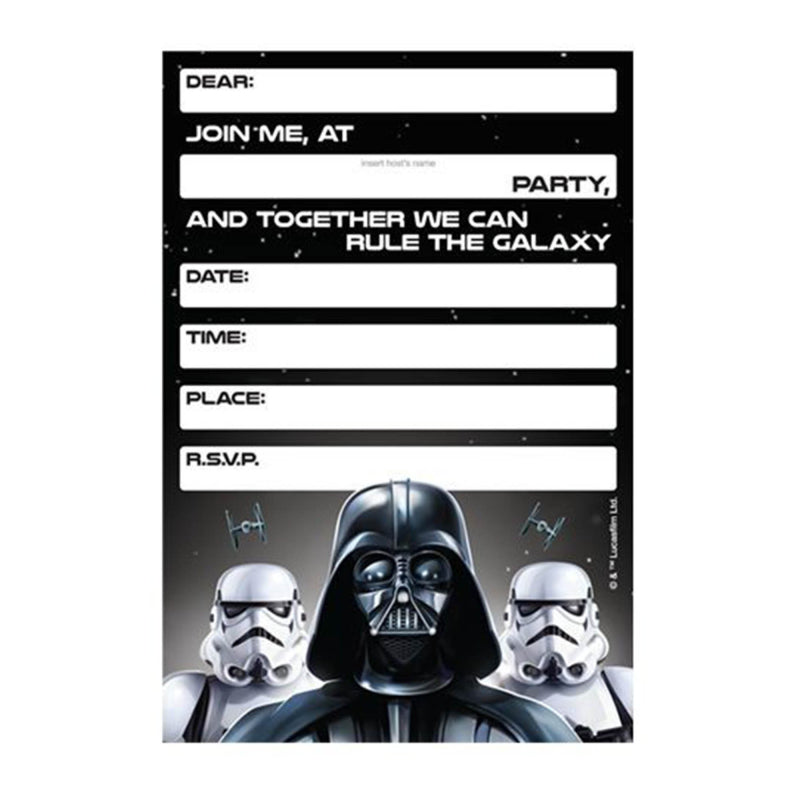 Set the scene for an epic celebration with these Star Wars invitations! Featuring a Darth Vader and Stormtropper design they’re perfect for birthdays and themed parties.