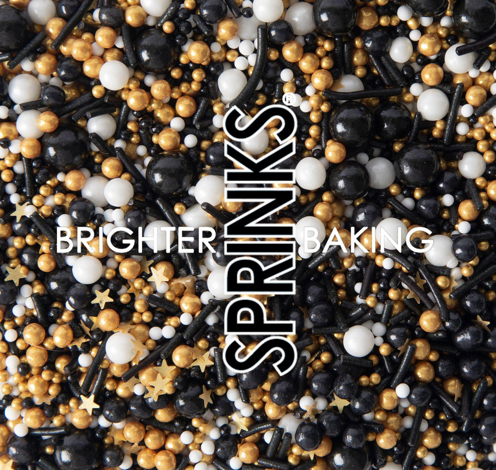 Featuring a collection of gold, black and white sprinkle balls with gold stars and black sticks mixed through. A great choice for a classy 21st, 30th, 40th, 50th or other significant milestone birthday.