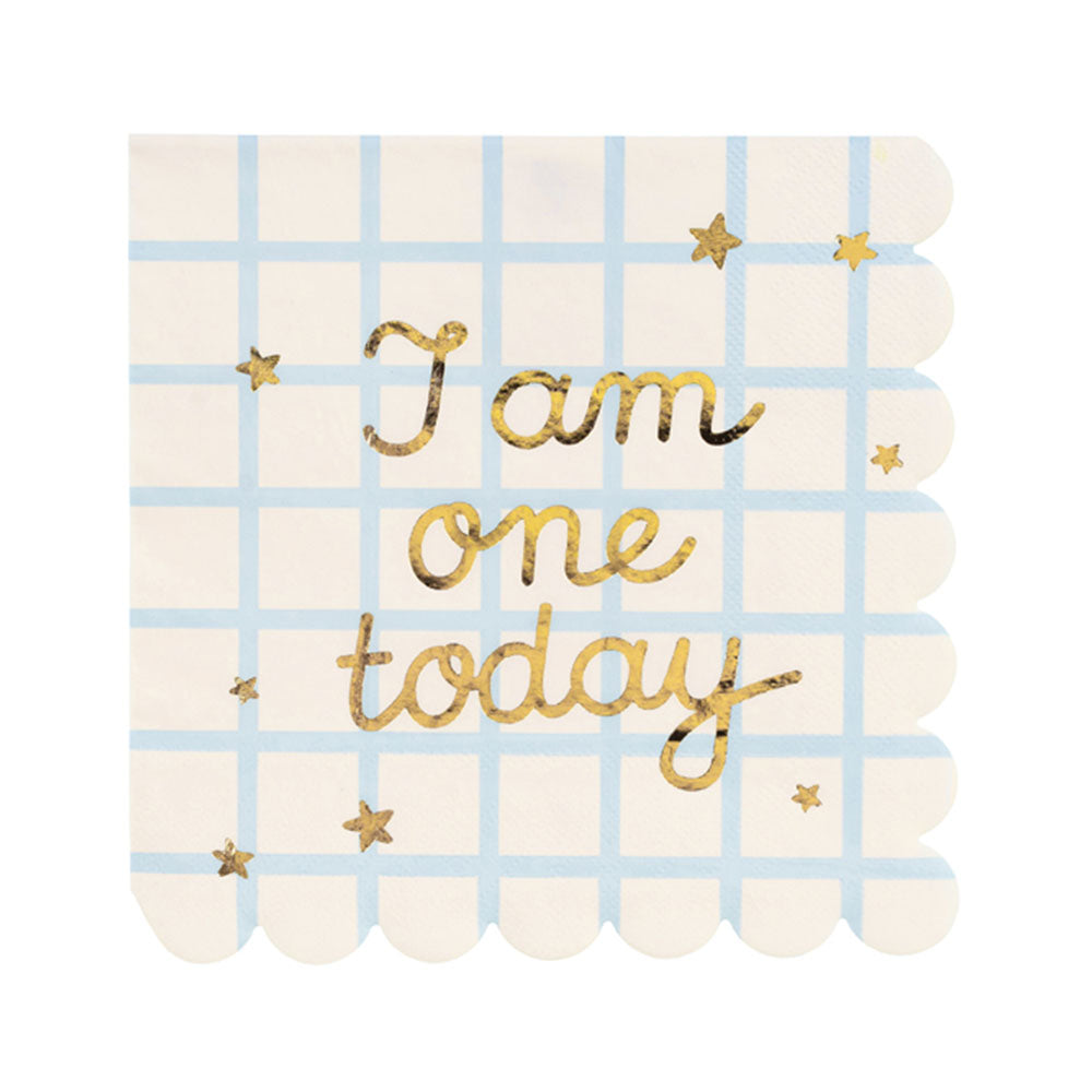 Celebrate your little one’s special day with these Teddy Bear One Today Napkins! Featuring an adorable pastel blue grid design and “I am one today” gold text, they’re perfect for keeping tiny hands and faces clean during a first birthday party.