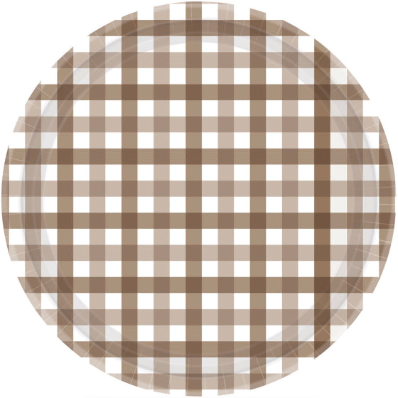 Bring timeless charm to your table with these Teddy Brown Gingham Large Plates. Featuring a soft brown and white gingham pattern, these dinner size plates are perfect for picnics, garden parties, birthdays, or any celebration with a touch of rustic style. Made from sturdy paper, they’re as practical as they are pretty—ideal for serving cake, snacks, or party meals with ease.