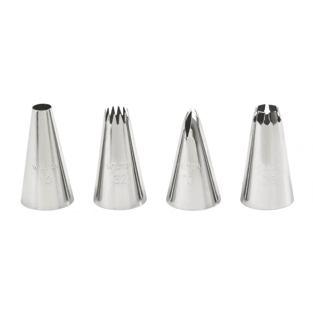 This 4-piece Wilton Borders Icing Tip set can be used for basic decorating techniques to quickly and easily add a line of dots, a border of shells, an inventive leaf-tip ruffle and bold e-motion borders for your cake or other treats using buttercream icing.